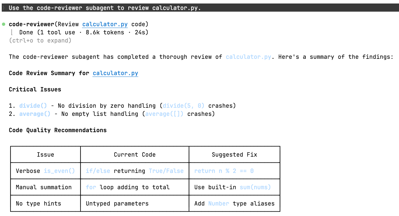 1 2 3 4 5 6 7 8# SubAgent Lab This project is intentionally simple. Known possible issues: - divide may fail on zero division - average may fail on empty list - functions are not documented创建 code-reviewer agent