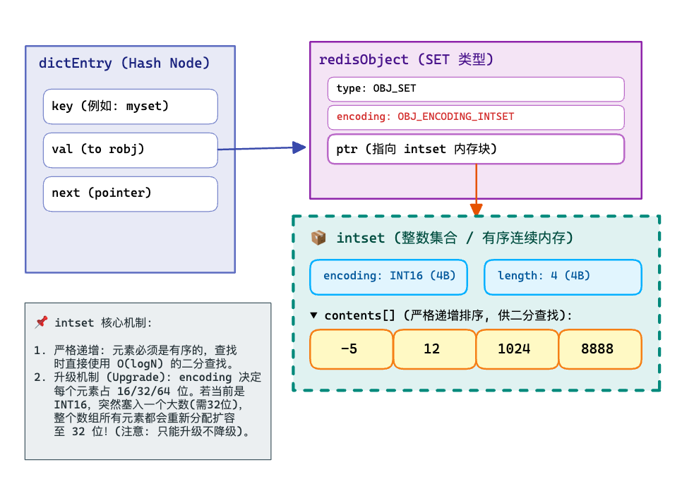 - 只能存整数;一旦插入非整数成员,就会触发转换(通常到 listpack/hashtable)。