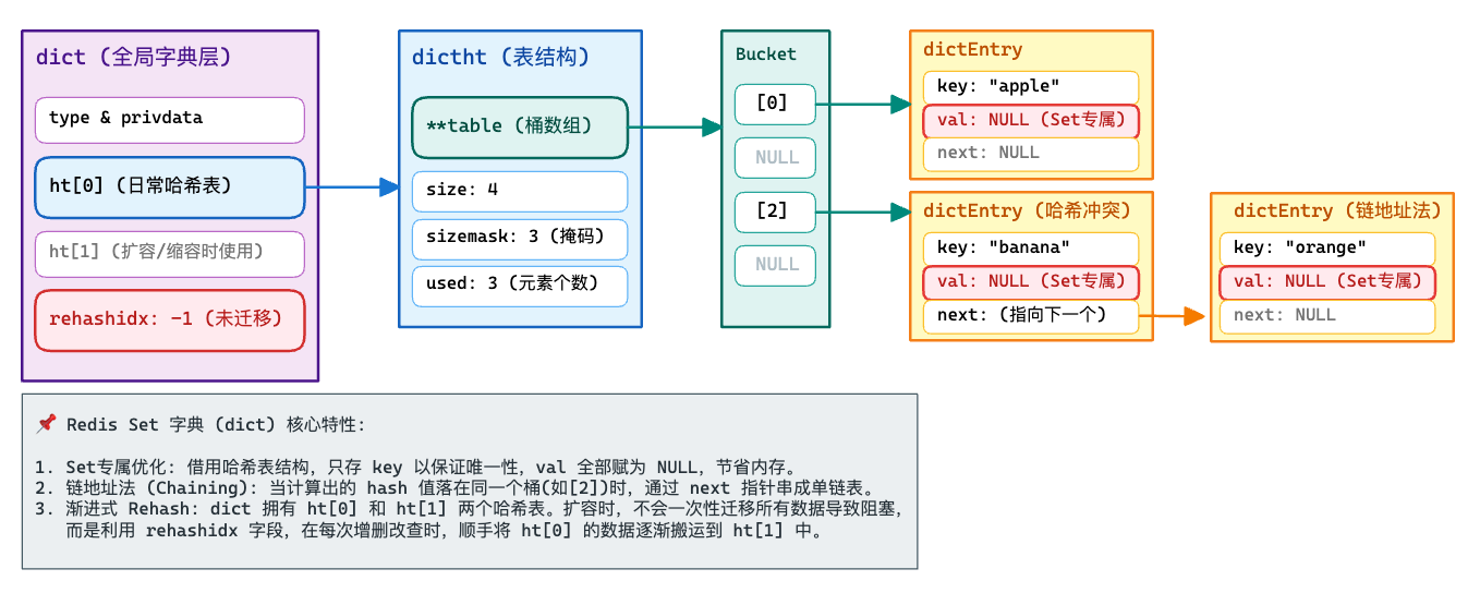 - rehashidx:rehash 进度索引;-1 表示没在 rehash;>=0 表示正在把 ht[0] 的 bucket 从这个下标开始搬迁到 ht[1]。